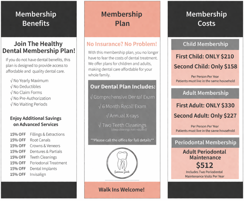 - LUMINOUS SMILE MEMBERSHIP PLAN: This is a dental membership plan and is not to be considered a dental insurance plan. The dental membership plan is for patients without dental insurance and cannot be used in conjunction with a dental insurance plan.
